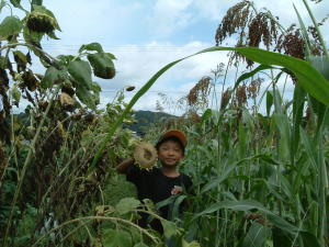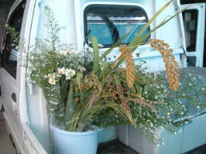 ヒマワリの種の収穫、アワ、イナキビ、タカキビ、ヒエを生け花用に刈って風ぐるま市場に出荷しました。3〜4種類で1束100円です。晩は常山公園で月見茶会があり、早速生け花に使っていただきました。右の写真は携帯電話で取った写真なのでわかりにくいですが、竹篭に飾られ、とても雰囲気が良かったです。ひまわりの種は丸のまま50〜100円で出荷してみました。子供から大人まで種の並びに感心してましたが、あまり売れてませんでした。1つで500〜1000個の種がとれます。炒って中の実を食べることもできます。