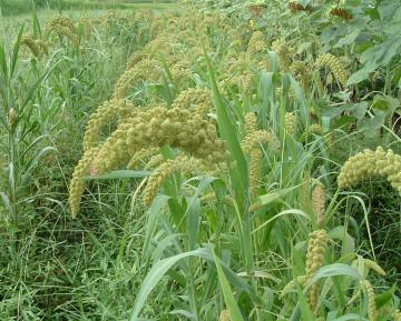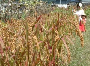 | 9月13日の写真です。手前左がアワ、右がヒエ、奥はタカキビです。ヒエは発芽が悪かったため、草に埋まっています。 | 収穫直後のヒエ。1〜2週間後に脱穀予定です。 |