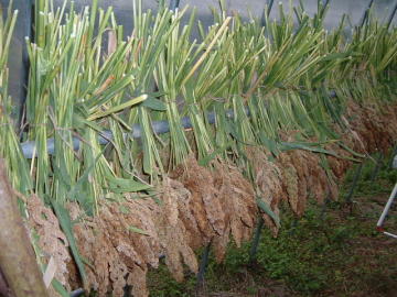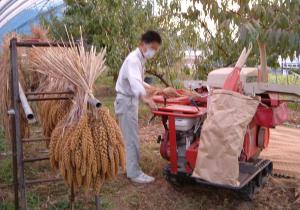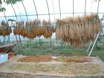 9月20日からヒエの収穫を始めました。大半の穂が8割以上茶色になってから収穫を始めます。すでにほとんど茶色になっていますが、雨のため半分程度収穫して作業をやめ、ハウス内のパイプに掛けました。ヒエは脱粒しやすいので刈り遅れると減収します。これから、イナキビ、アワ、タカキビの順に収穫していきます。収穫後は、雨除けハウスで乾燥後、脱穀の作業を行います。
