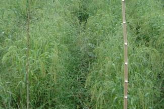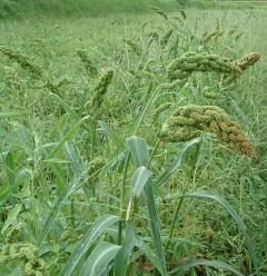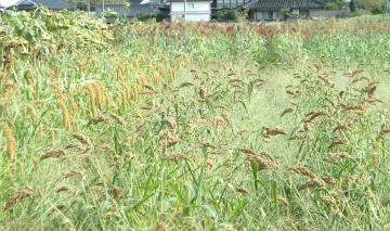| タカキビです。だいぶ穂が赤くなってきました。草丈は約2mです。 | イナキビです。メヒシバと競争してます。草丈は約1mですがかなりしなって一部倒伏しています。 | ||
