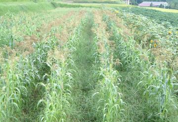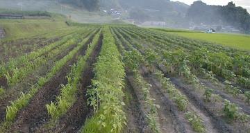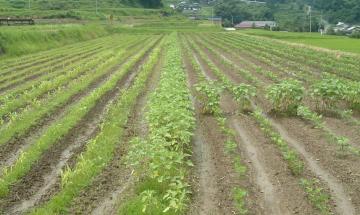 | やっと梅雨明けしました。雑穀は追肥後耕うん機で2回目の中耕をし、タカキビ、アワとヒエ、キビの丈の伸びているとのみ管理機で培土しました。また、手前のタカキビの発芽の悪いとこに小豆、ささげ、小粒黒大豆を播種しました。雑穀区は除草剤が使えないので大変です。 大豆はやや生育が遅れてます。 |