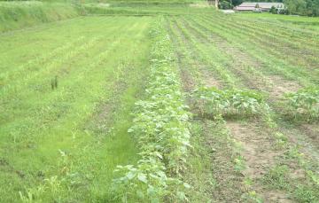 | 真ん中がひまわりで、左側が雑穀でタカキビ、ヒエ、アワ、イナキビを播いています。草と湿害とであまりよくありません。右側は大豆です。大豆は播種後に雑草の発芽抑制剤を播いているので多少草が少ないですが、雑草が大きくなってきました。どちらも早く中耕除草をですが、天気の関係でなかなか作業ができません。大豆は出勤前に草の多いところに大豆の畝間散布で登録があるハービー液剤を散布しました。また、土曜日に3時間かかって圃場周辺の畦畔の約半分の草刈をしました。日曜は一日雨で何もできませんでした。 スモモも雨除けをしてますが病気と虫とで毎日30個ぐらい処分しており、学校給食にはあまり供給できないかもしれません。 |