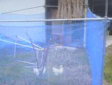 烏骨鶏は前回はヒヨコをもらって事故や寒さで死なせてしまいましたので、今度は大きくなったオスとメスを町内の方から頂きました。小屋は町内の2ヶ所の飼育農家を見学し、網と合板1枚を除き、家にあった材料でつくりました。車庫の隅に小屋をセットし、外で遊べるように、5m×5mぐらいの柵を作って、暴風ネットで囲み、上にはカラスよけにテグスを張りました。