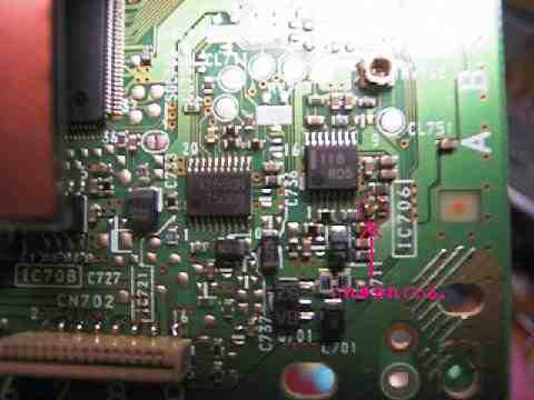 そしてピックアップのフラットケーブルを刺すコネクタの近くにチップコンデンサが外れてパターンが剥がれているのを発見しました。