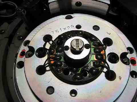 いまいち線が外れないのでそのままなんとかしました。回転する金属部分を引き抜きます。その後コイルと下ドラムを固定している2本のねじを外してコイルとドラムを分離し、コイルと基板が繋がっている3箇所のはんだを吸い取って基板を分離します。